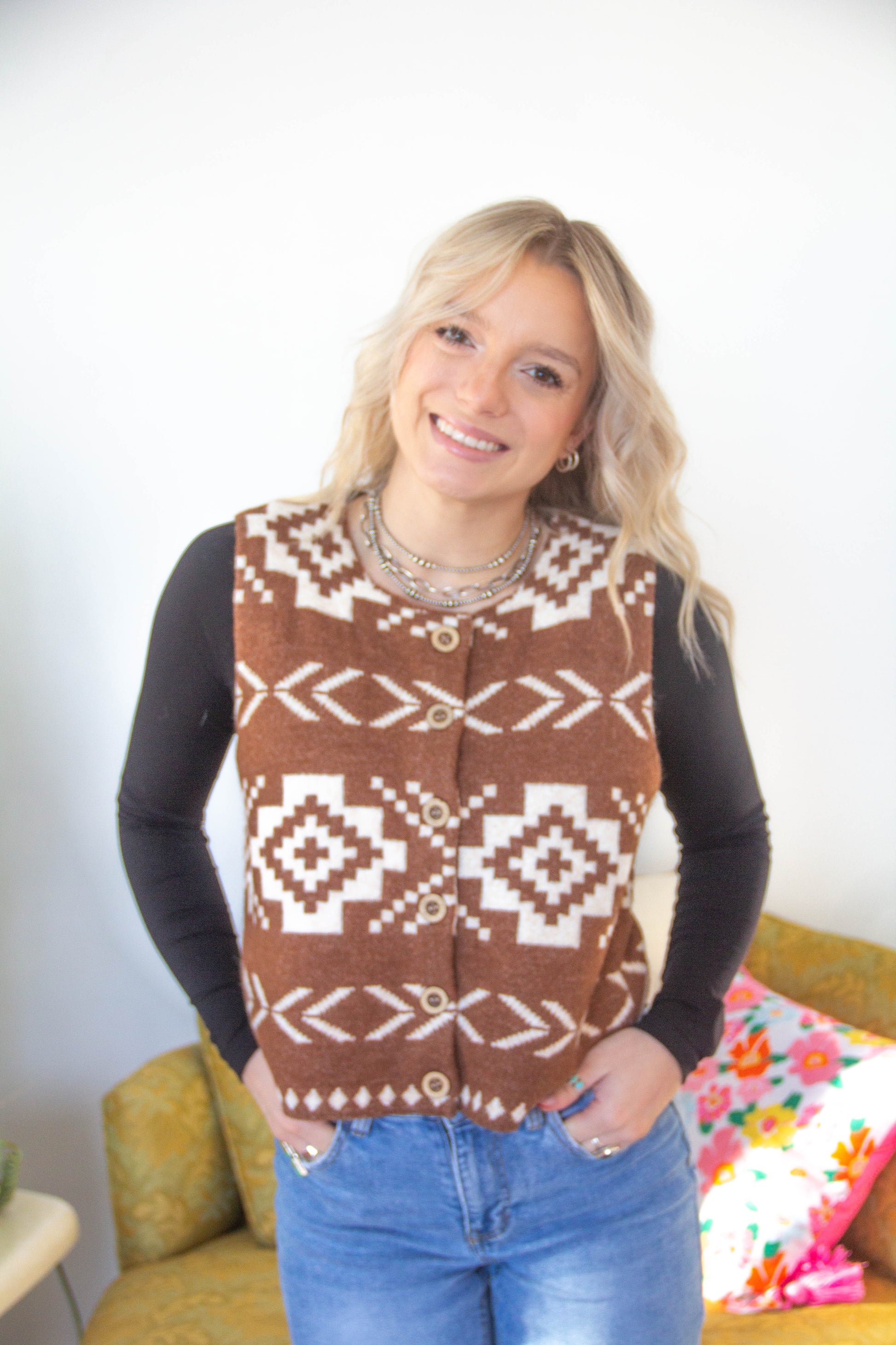 The Aztec Way Vest brings timeless geometric patterns to a cropped silhouette that flatters modern wardrobes. Crafted with classic proportions and neutral tones, this piece layers effortlessly over dresses, shirts, or lightweight sweaters. The intricate aztec-inspired design adds visual interest while giving you that classy, tailored feel.