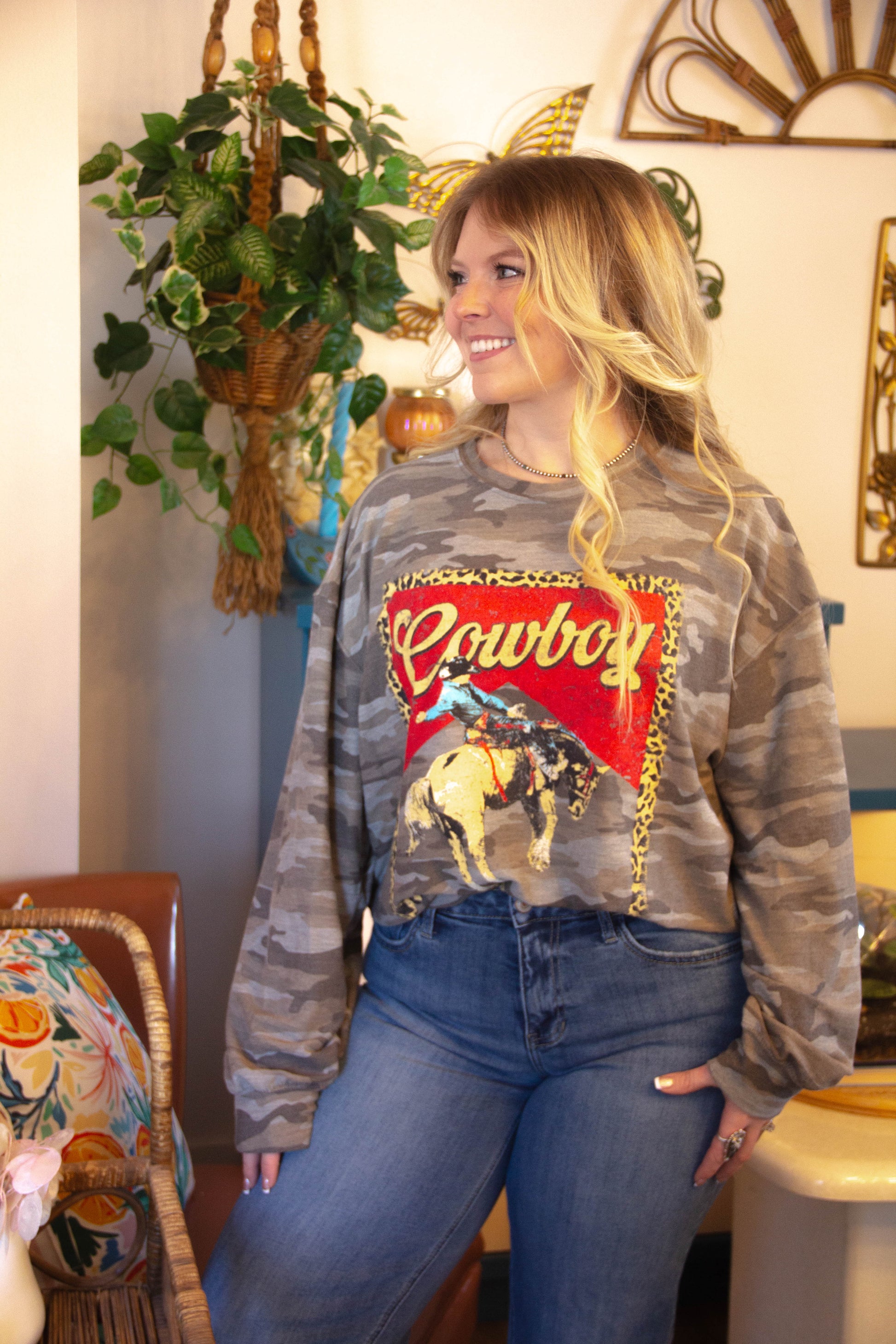 Camo Cowboy Crew Expertly crafted for those who appreciate understated style, this lightweight crew neck delivers comfort without bulk. The relaxed fit works best when sized up for that coveted oversized silhouette—perfect for layering or wearing solo. Breathable fabric keeps you cool whether you're on the range or in town. A modern take on classic Western wear that keeps you in trend.