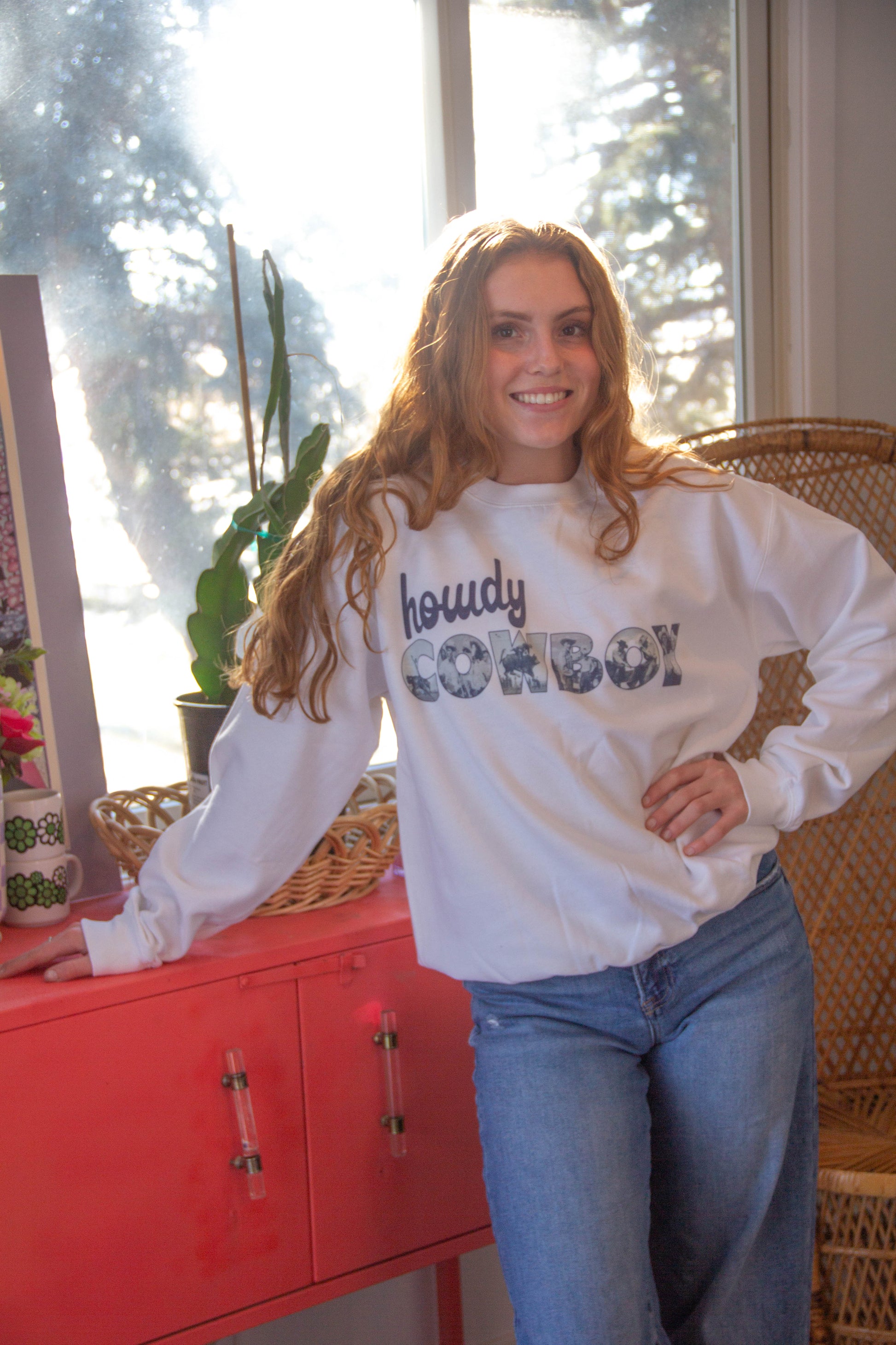 Hey Cowboy Crew sweatshirt brings timeless western style to your everyday wardrobe. This classic black and white design captures authentic cowboy aesthetics! It pairs effortlessly with jeans or casual wear. Built for comfort and durability, this crew neck sweatshirt delivers the iconic look of the Old West with a modern twist.