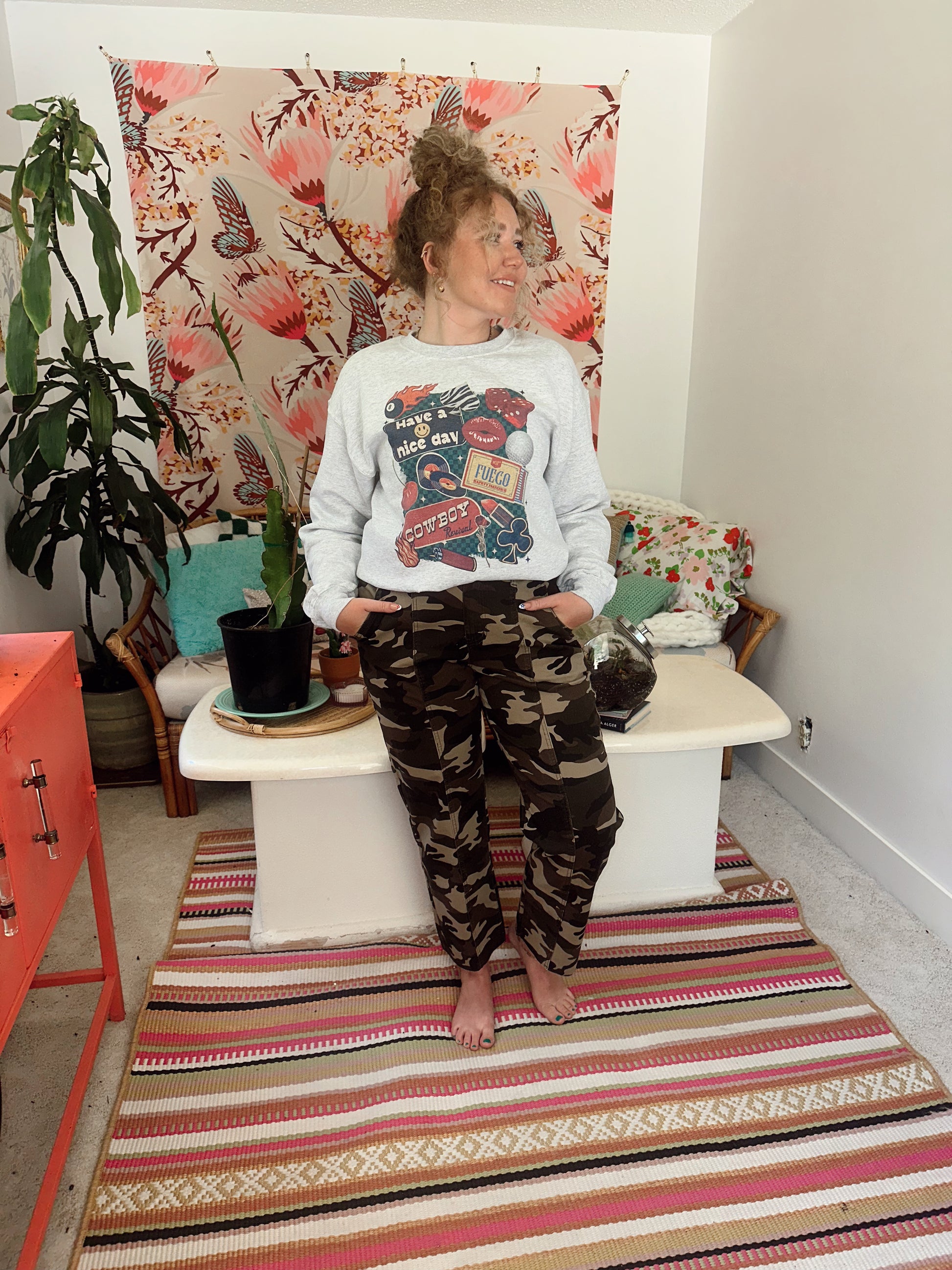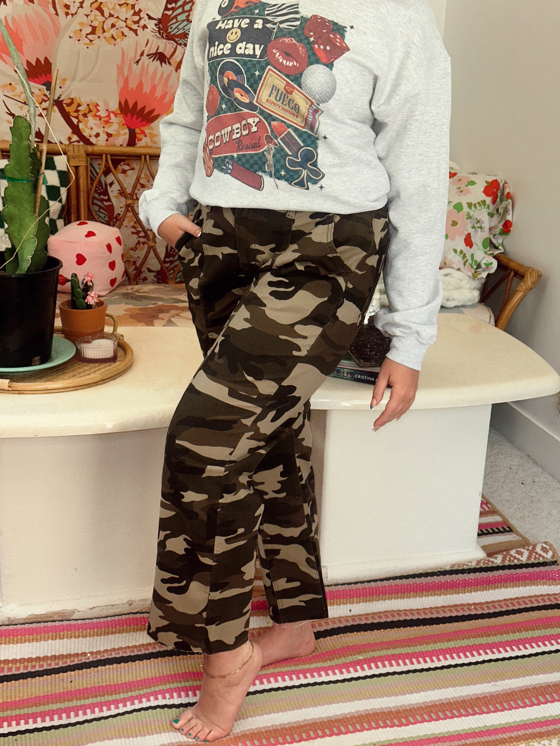 OBSESSED with camo and OBSESSED with these straight leg pants! Patterned pants are a great way to add some variety in any of your outfits. Model is a size 27 and wearing a size M. Please message us for more specific sizing details.