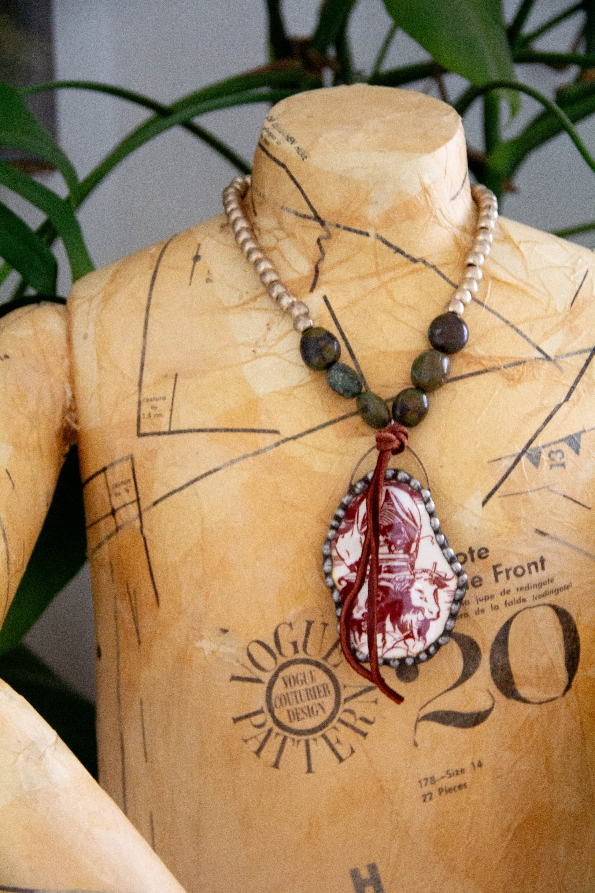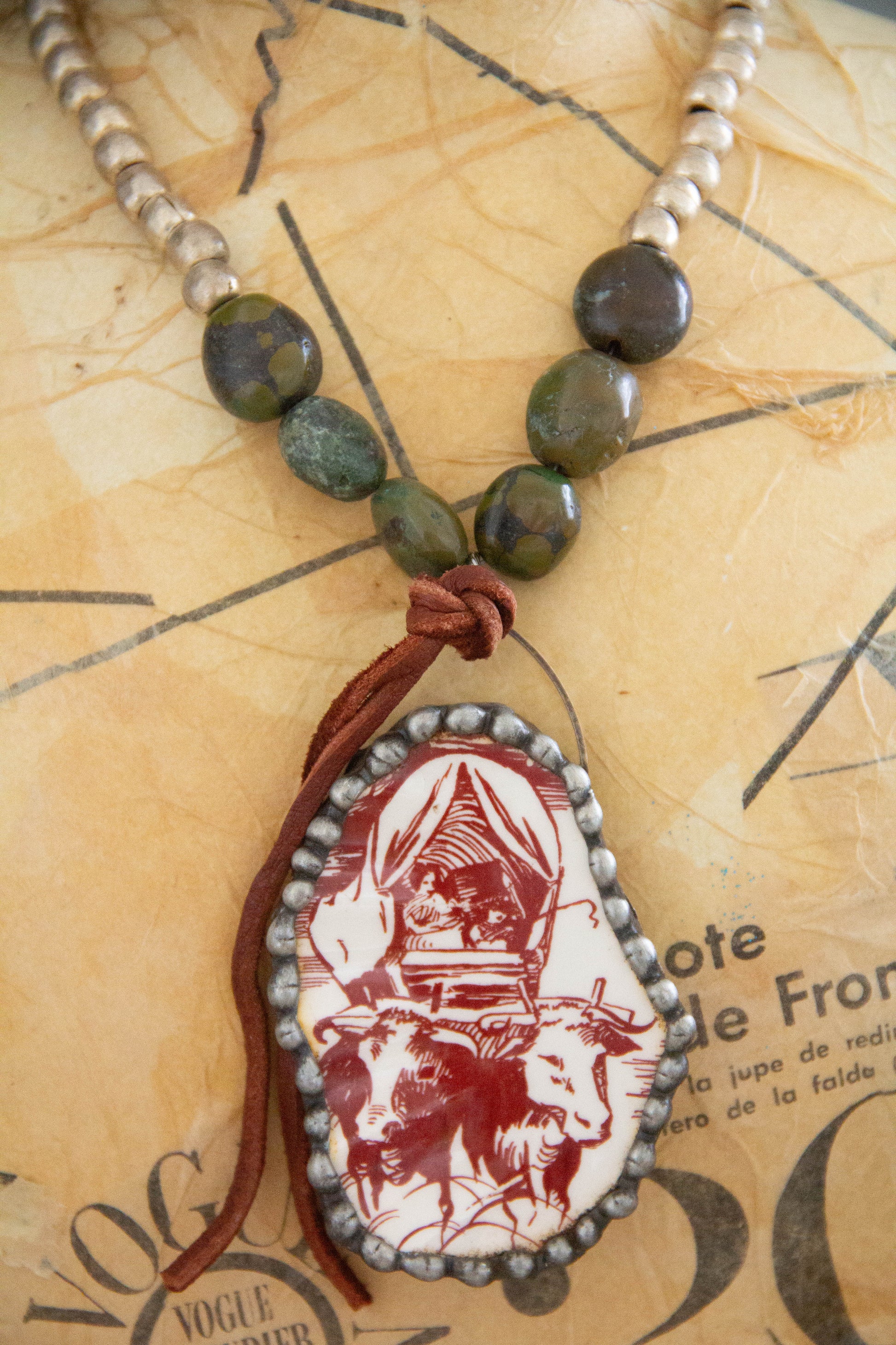 This one of a kind necklace is a nod to days past. The pendant is from a vintage plate. Added in leather details and a beaded chain with turquoise chunks make this a fun statement piece for your vintage western look.