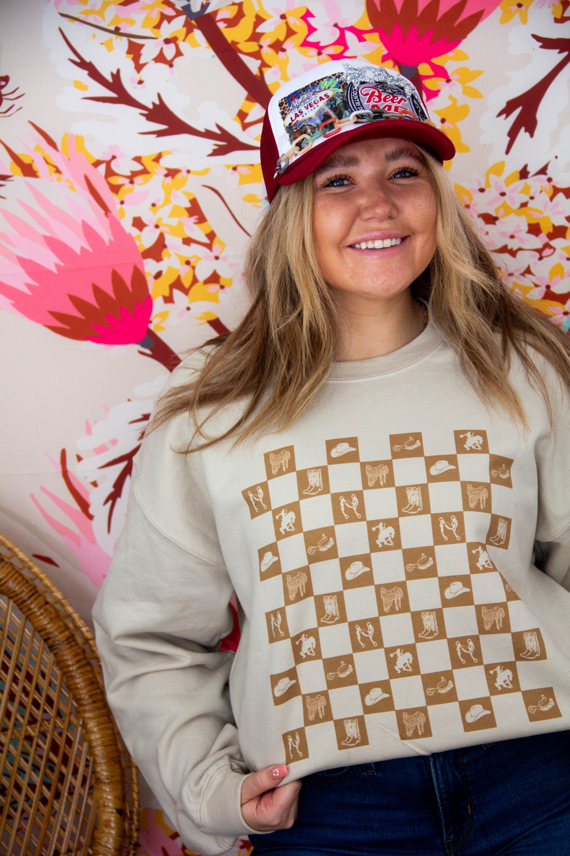 Our favorite checkered crew AND it is super soft! This crew does have a slightly cropped hem.