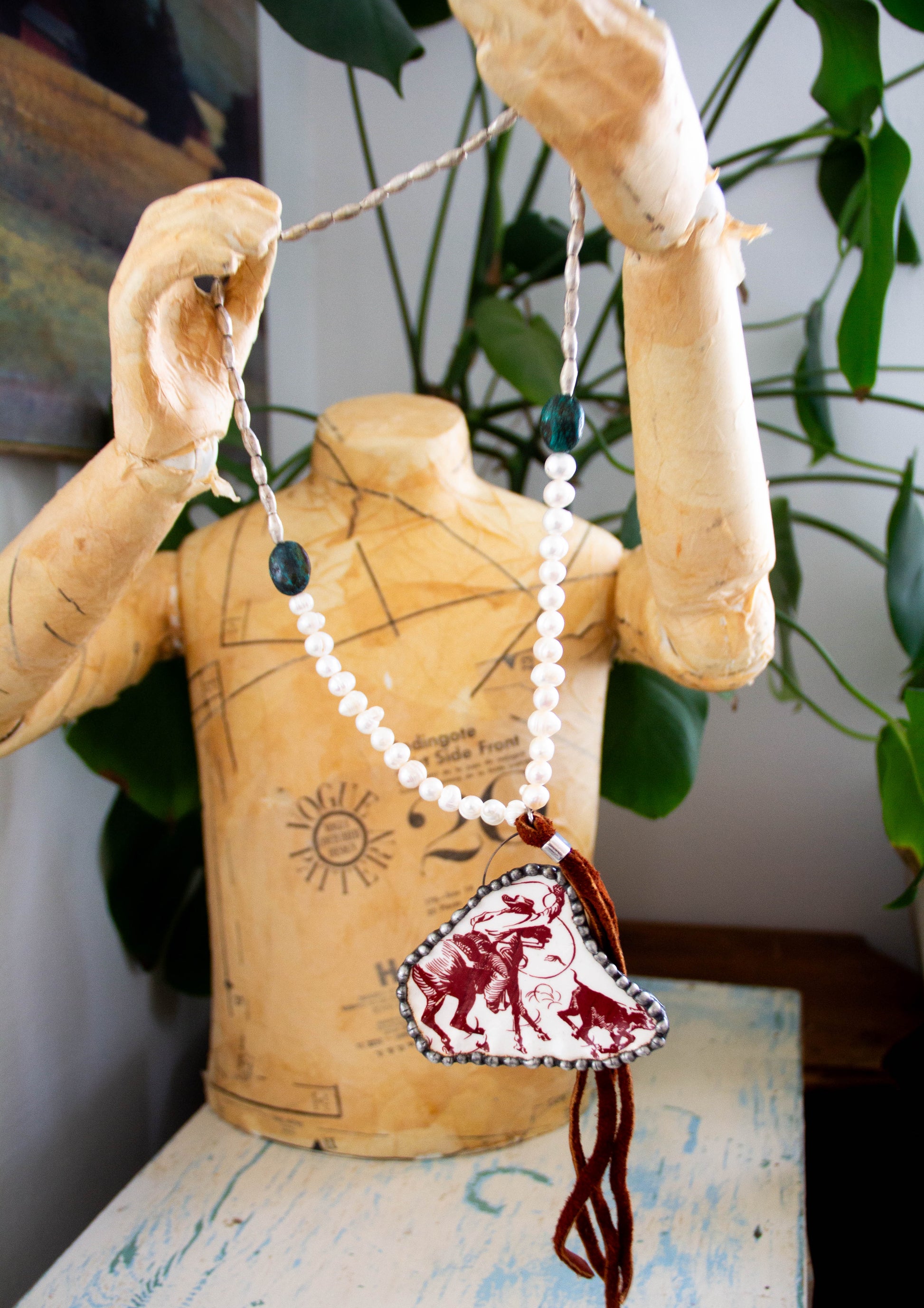 This ceramic vintage cowboy calf roper is beautifully done paired with simple pearls, a leather tassel, turquoise and silver beads. The simplicity makes it a stunner!
