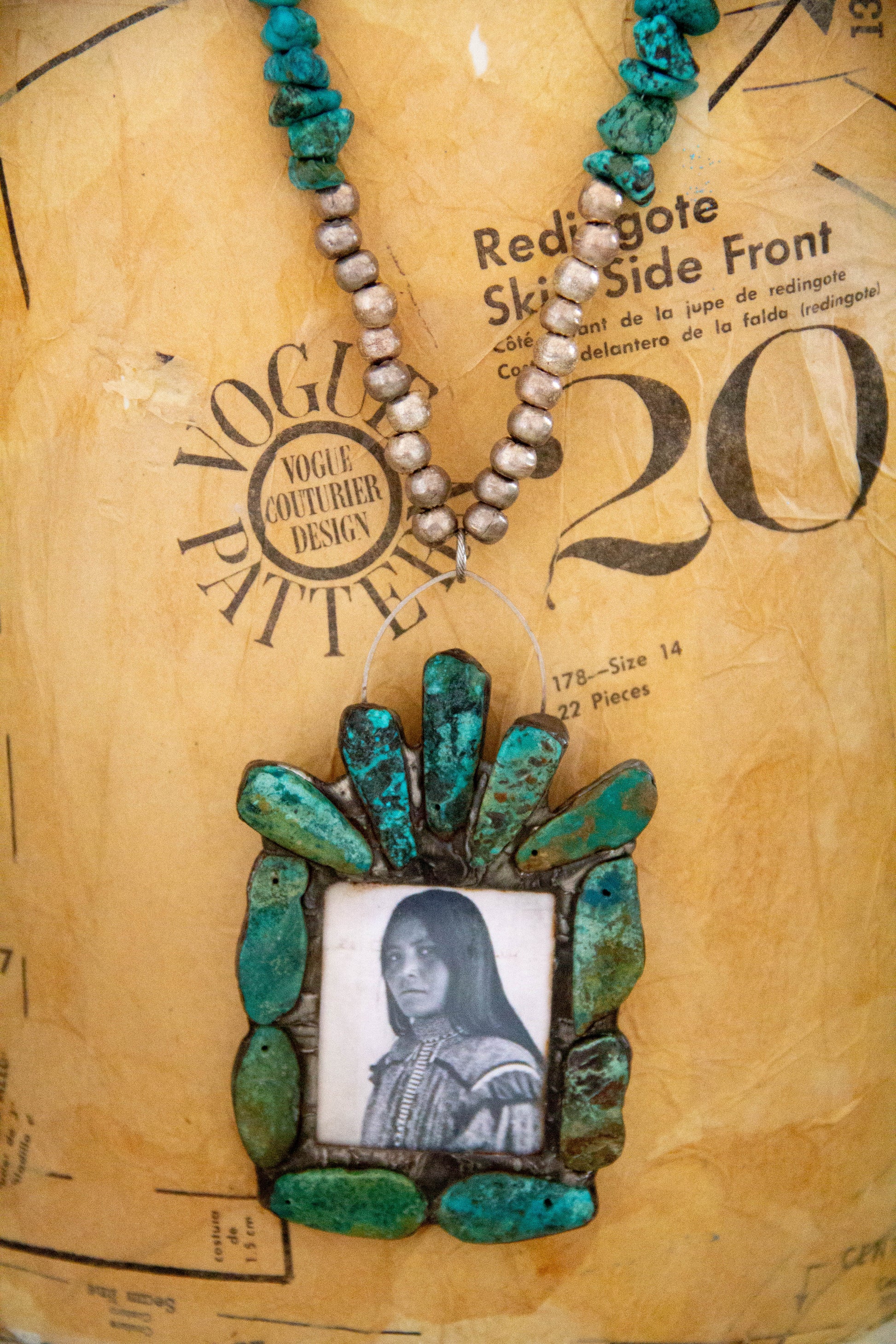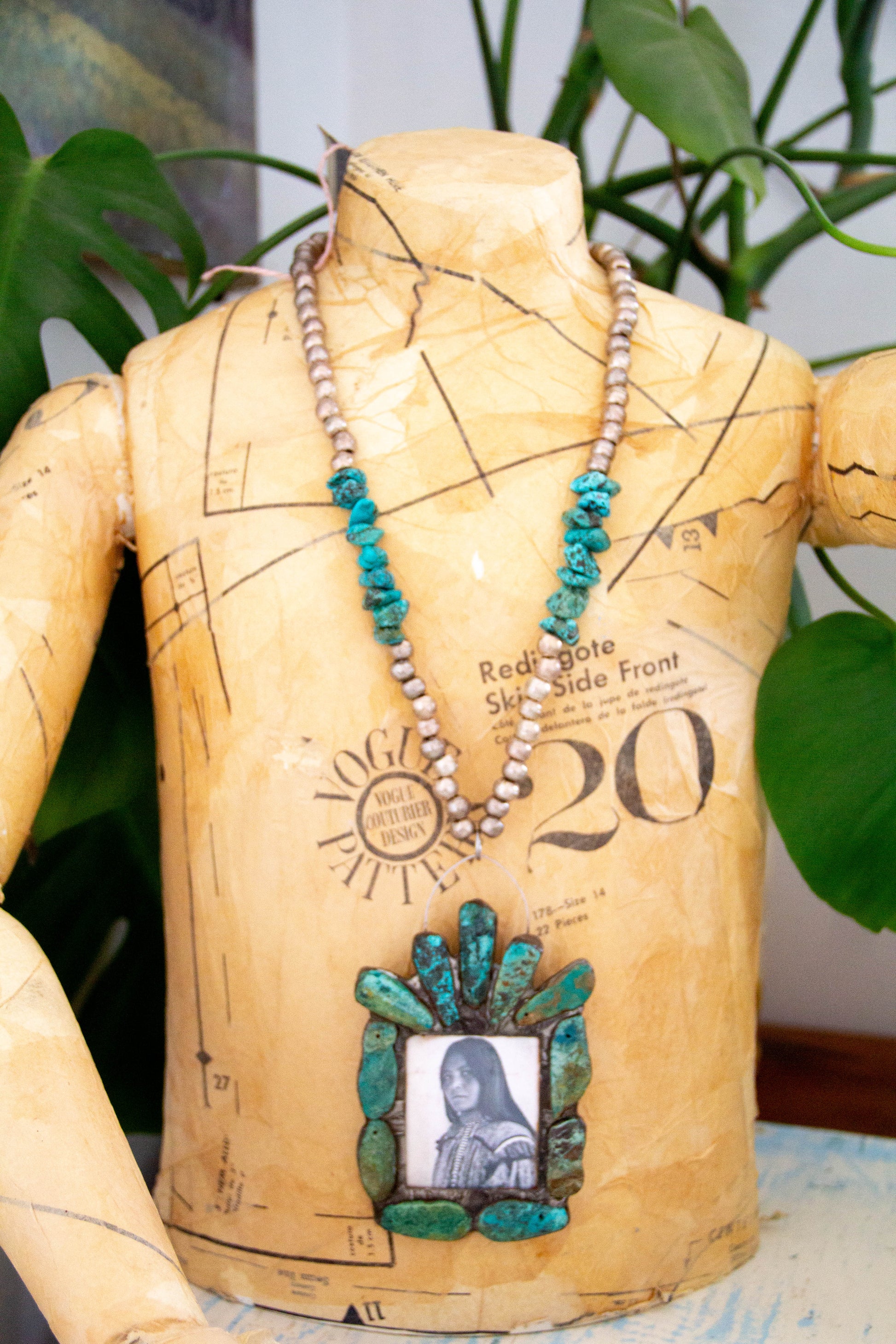 Some jewelry just is set apart from the rest. These beautiful black and white picture of a young Indian lady in her turquoise picture frame is simple yet absolutely stunning. We love the chunk turquoise with silver beads.