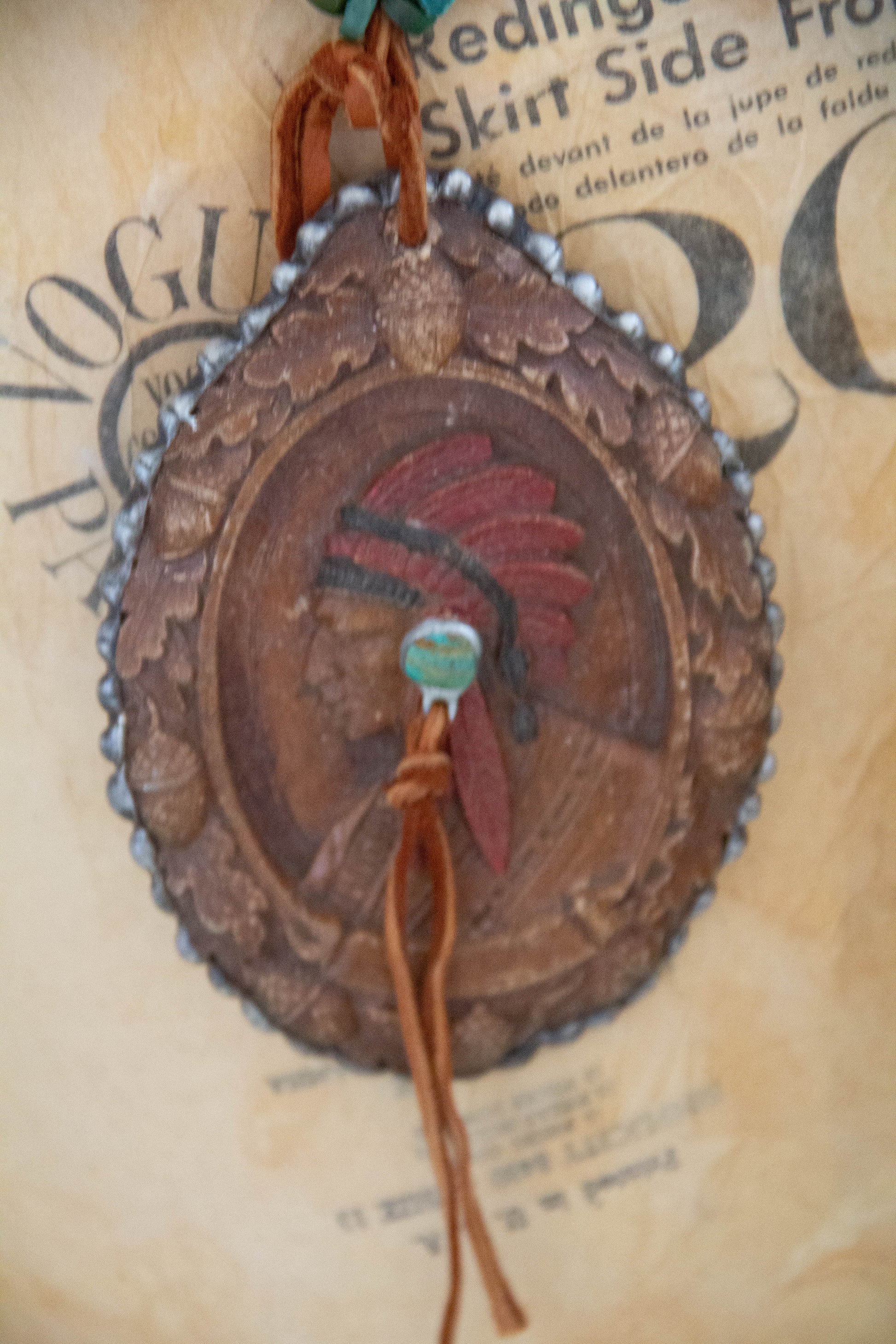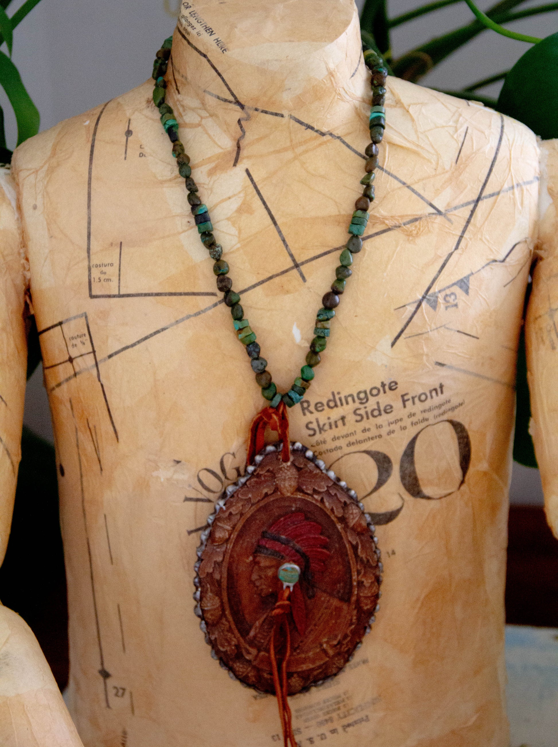 This is an amazing piece by our favorite jewelry designer. The Indian chief is from a vintage Syroco plaque. Added stones and leather accents and turq heishi beads make this a piece that will be handed down for generations to come.