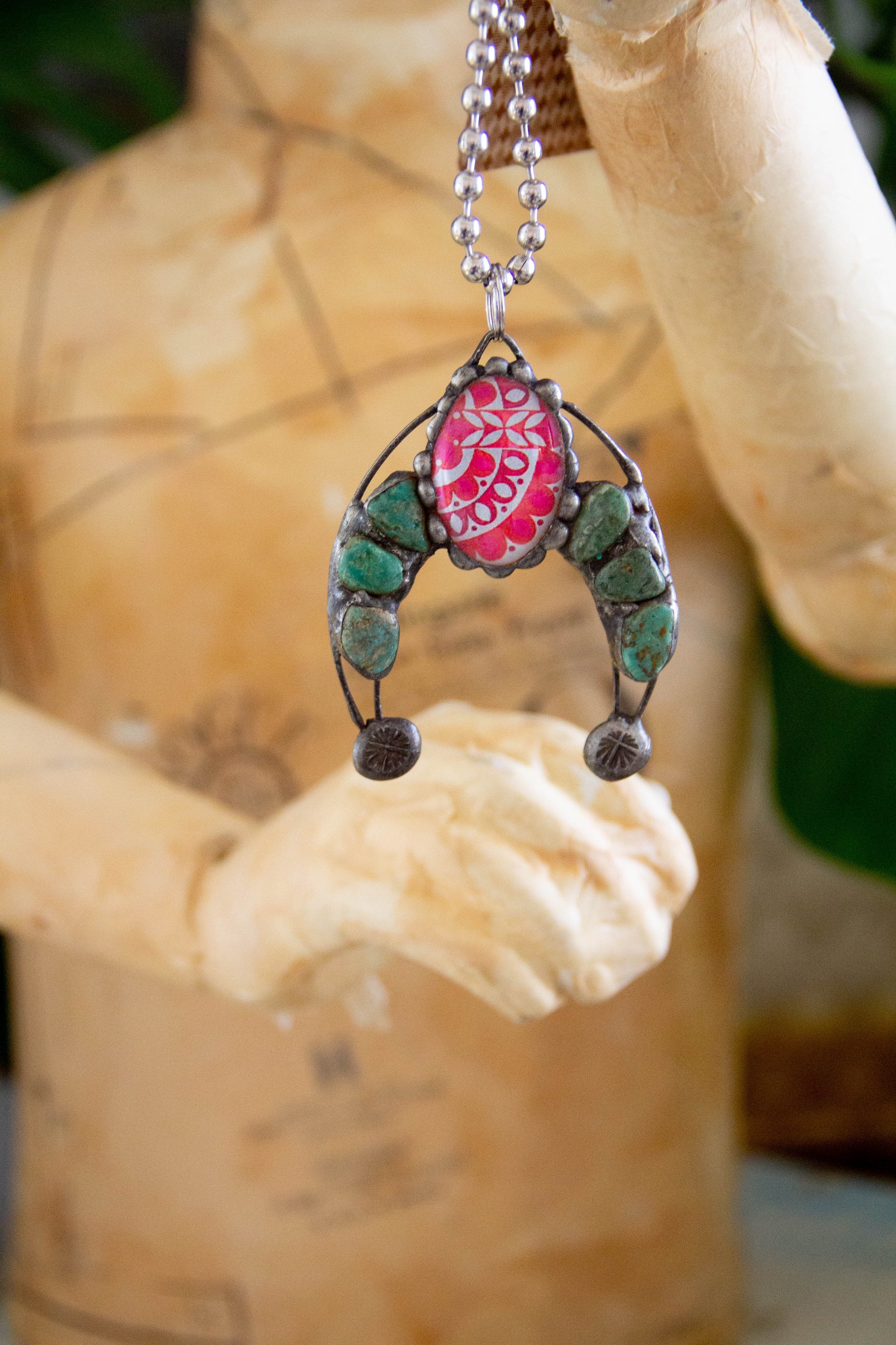 This pink and turq naja on a ball chain is a fun addition to your tee.