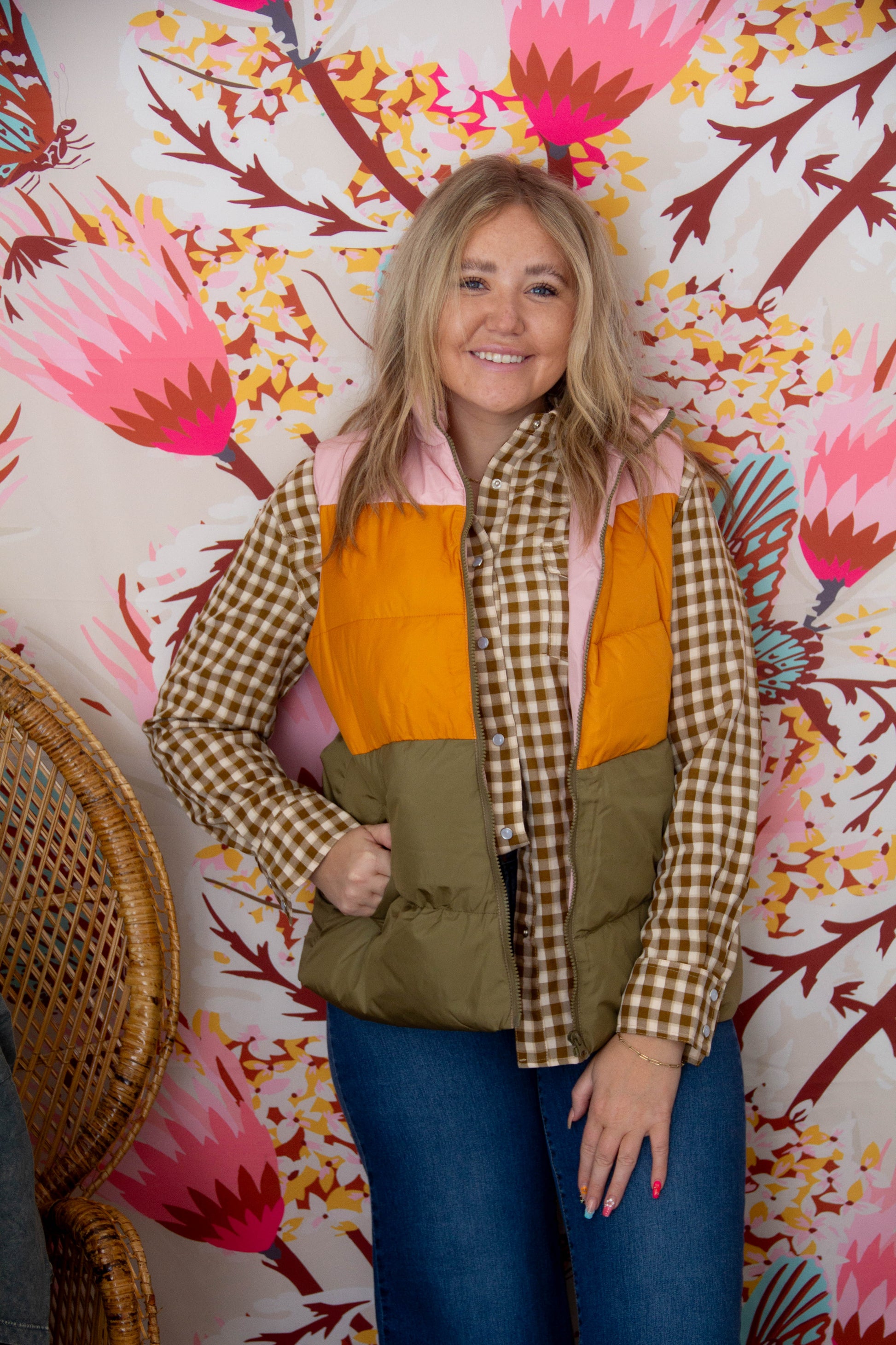 This vest is light weight and is a great longer length for those who like a bit more coverage. We love the color combo that makes a perfect blend from winter to spring.