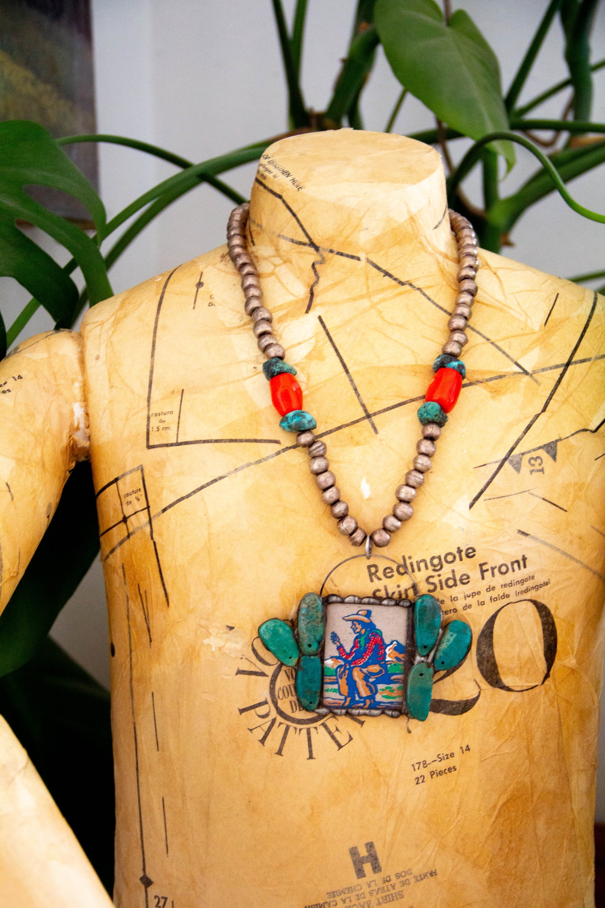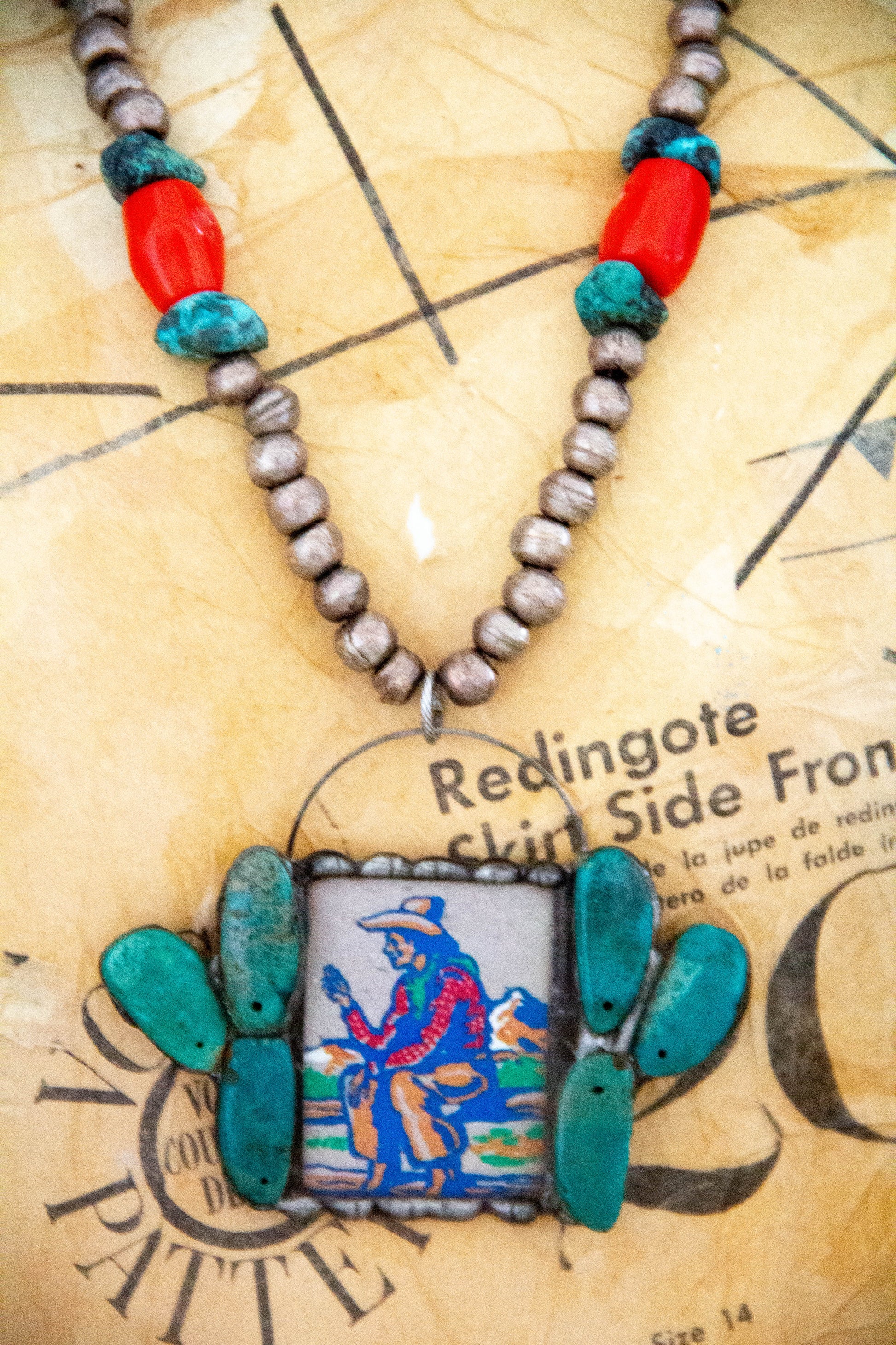 Classic vintage western colors. This necklace with it's vintage cowboy enjoying his fence sitting view surrounded with turq cactus sides gives a perfect nod to days gone by. We love the beading on this necklace, a great jewelry box staple.