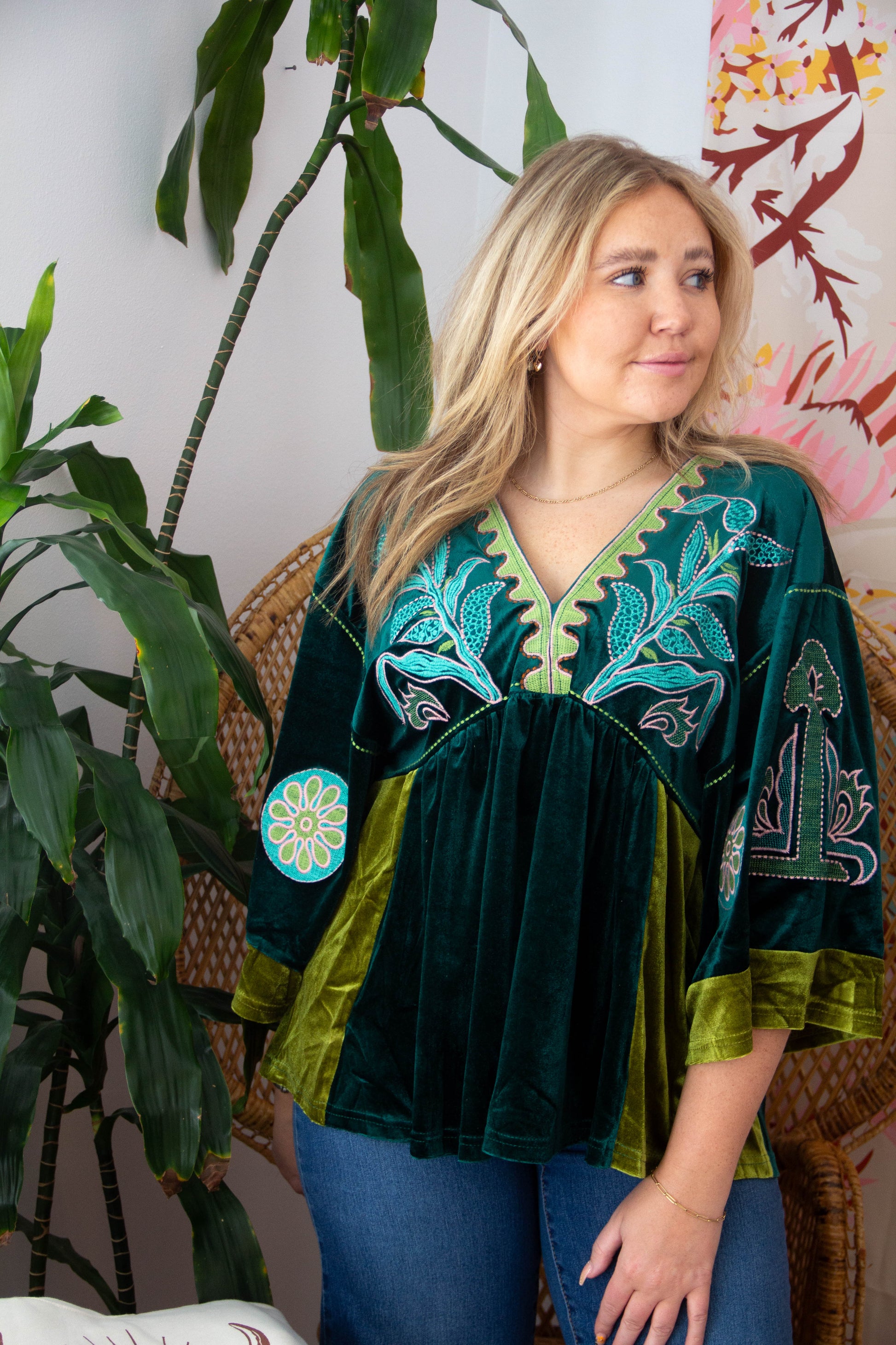 Nothing better than a classic top to put together any outfit! When you add in velvet and embroidery, and beautiful shades of green, you will be heading out in style. We love the flair hem and bell sleeves.