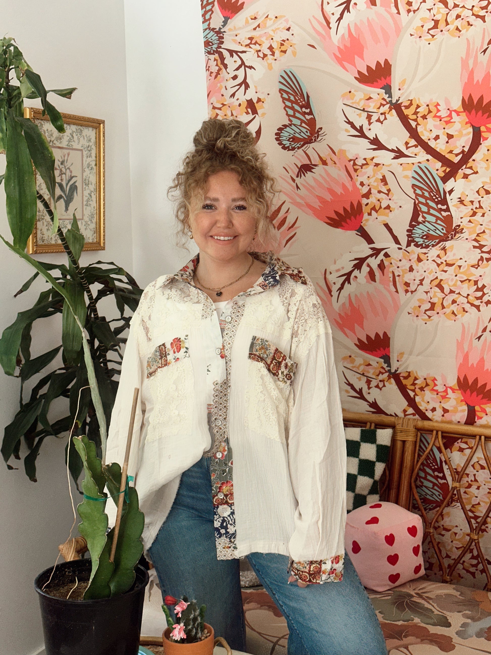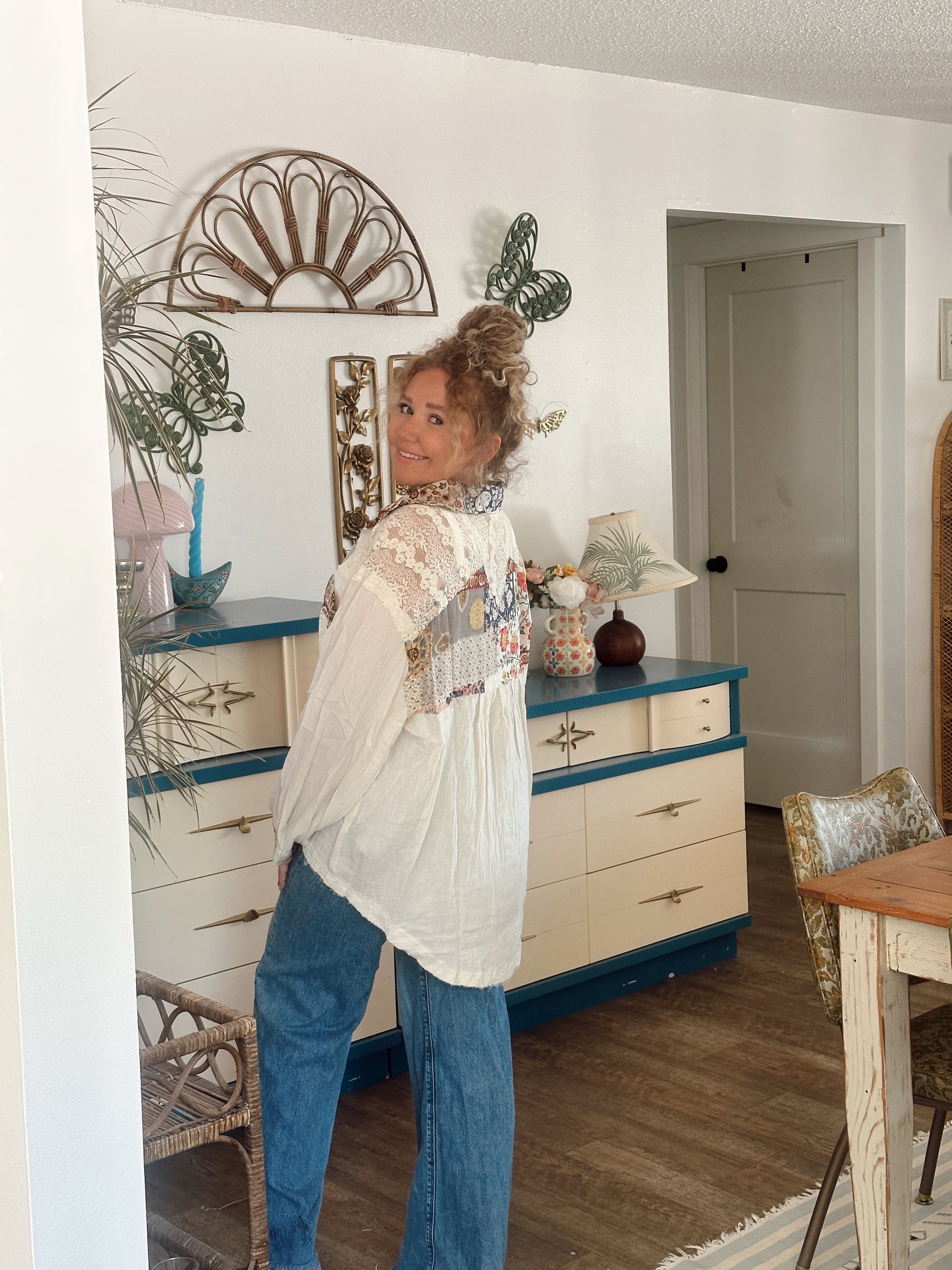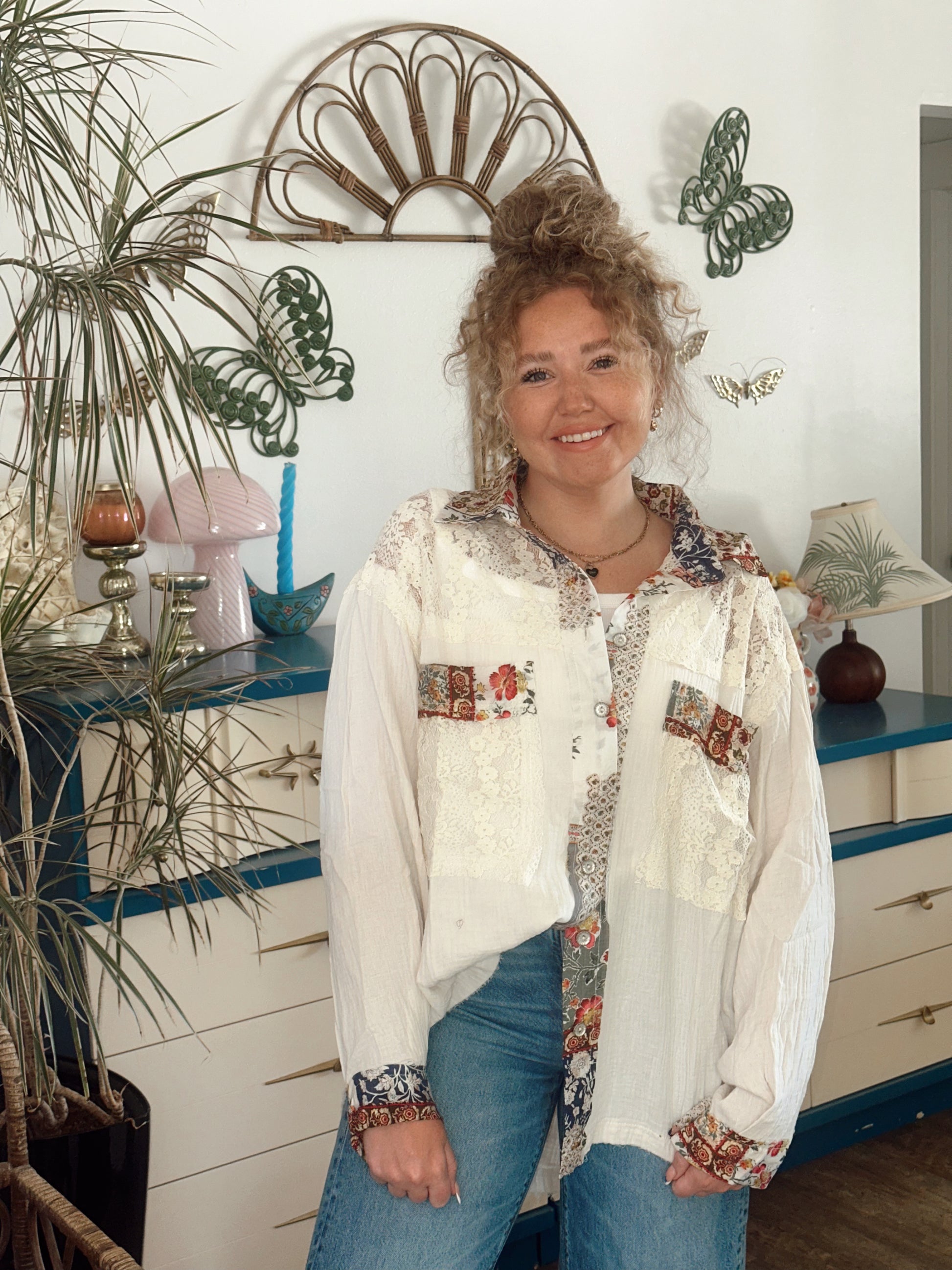 This is a fun spin on your classic White House. This light weight blouse is the perfect addition to your cool summer mornings or late night bonfires. Wear open or buttoned to enhance any outfit. Fits slightly oversized.