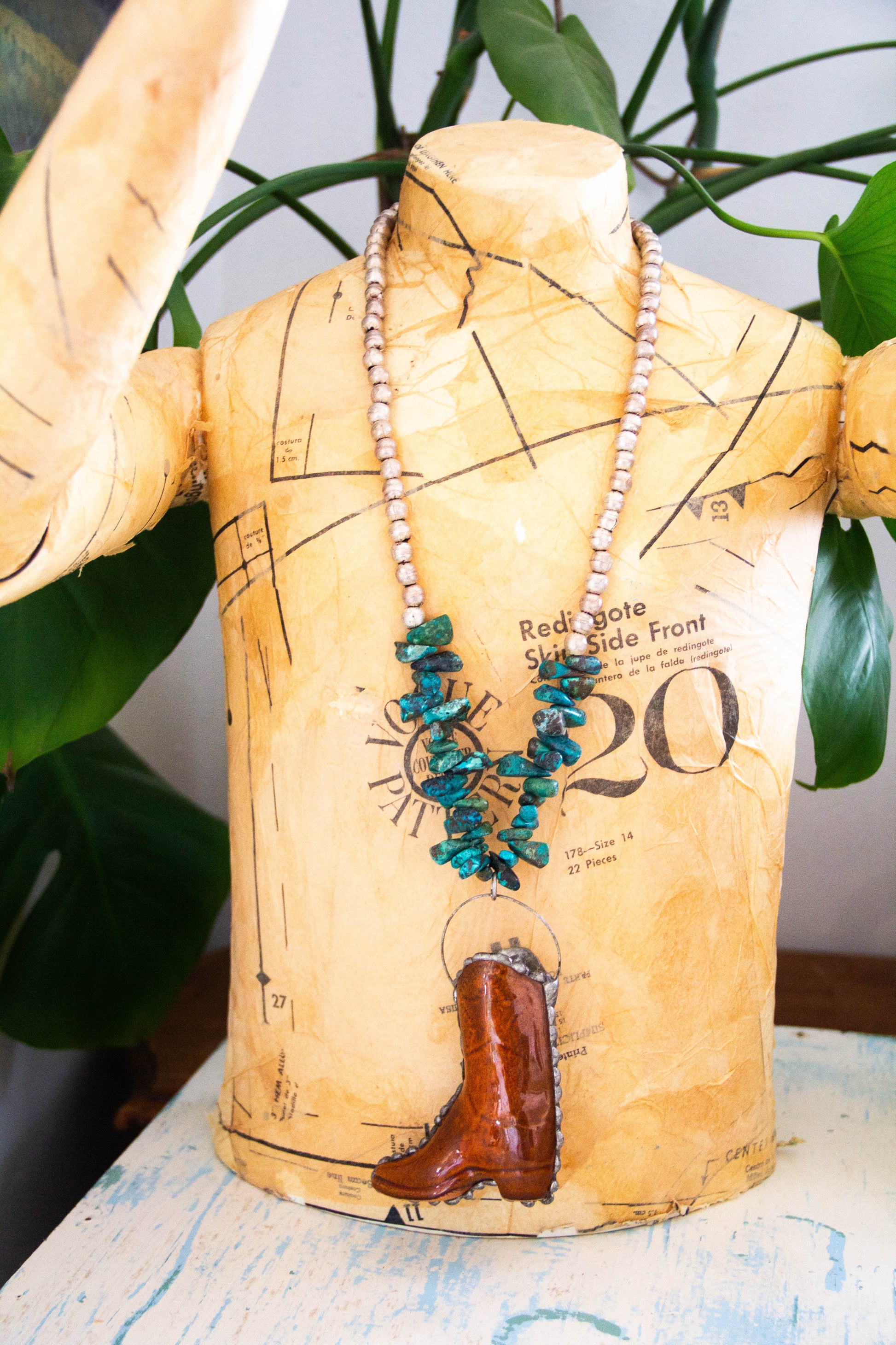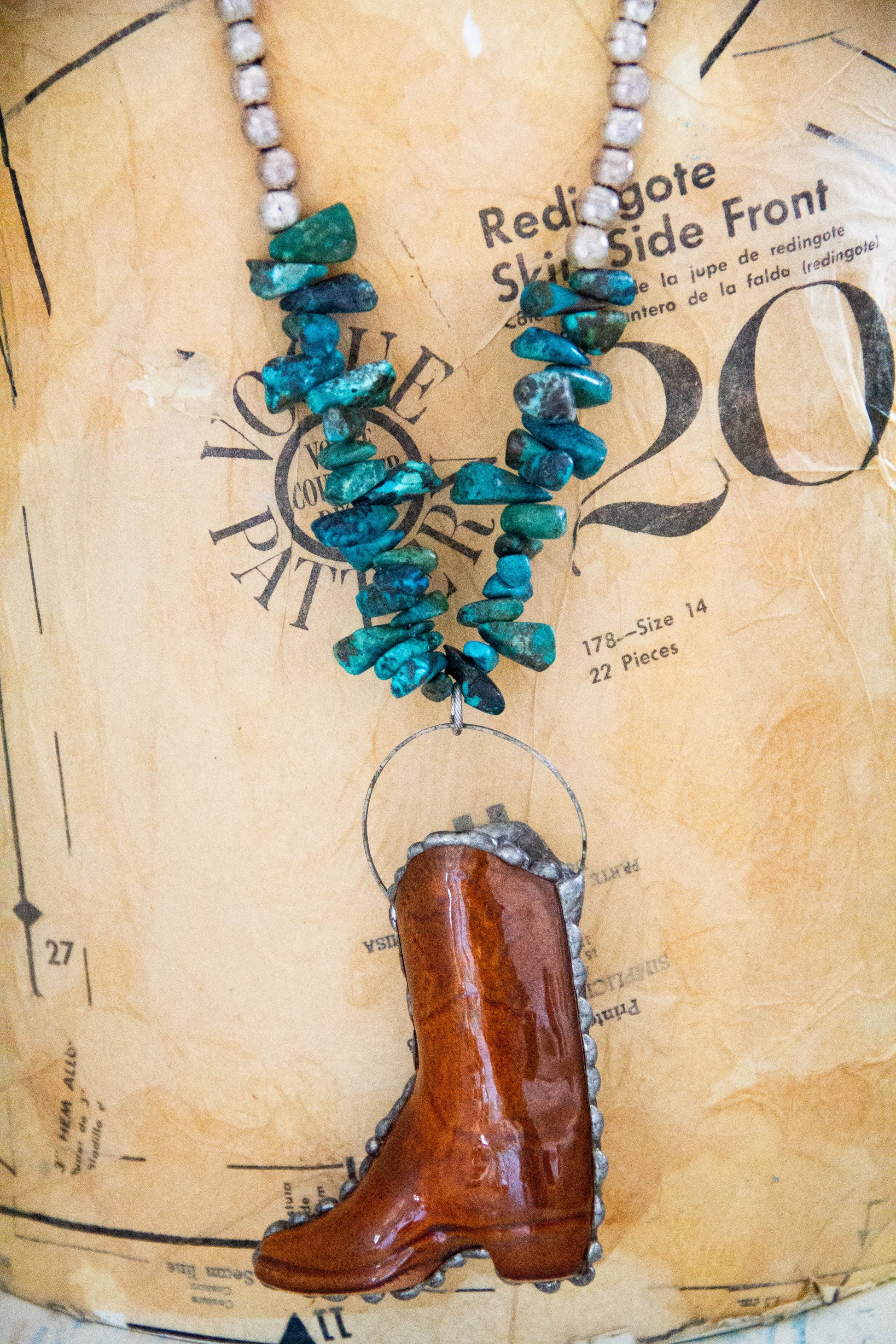 A fabulous ceramic boot pendant on silver beaded chain with chunk turquoise. Need we say more!